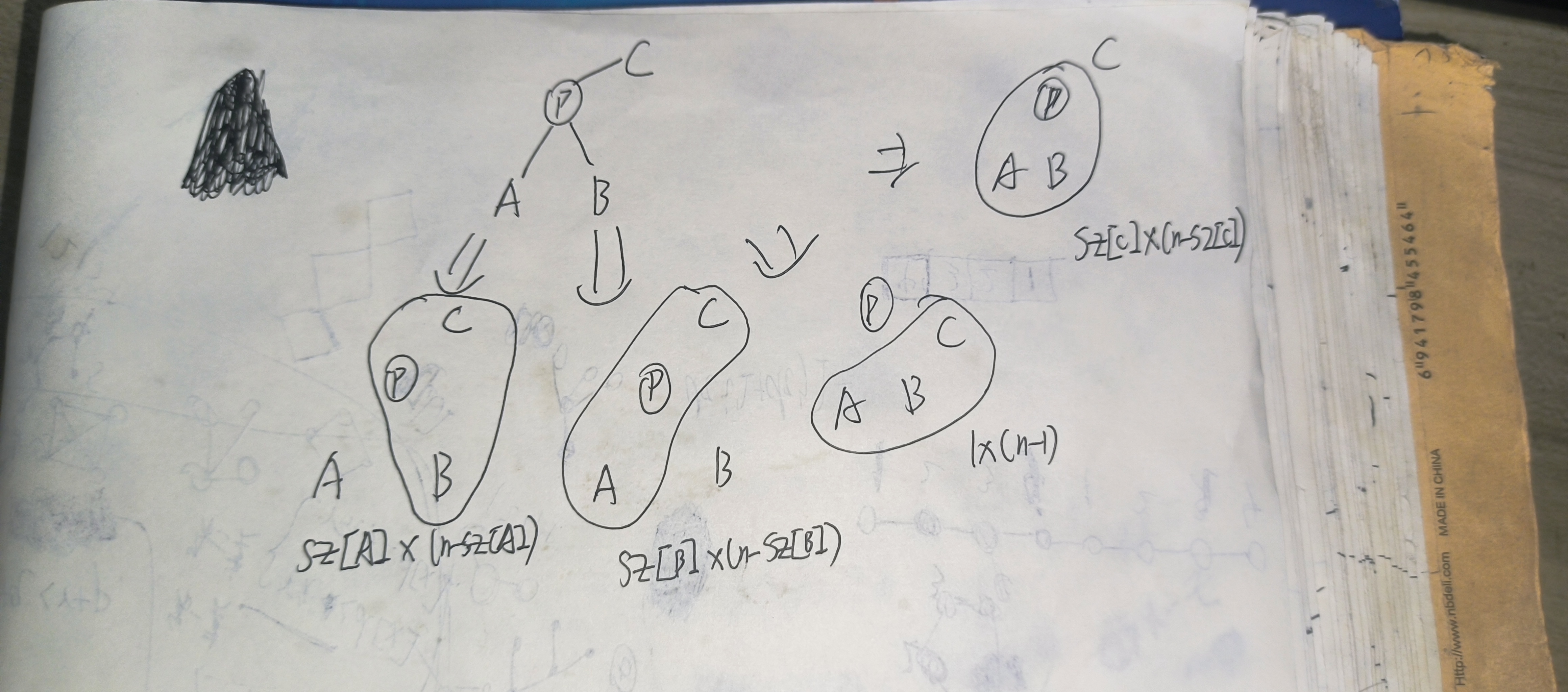 voidtarjan(int x){ dfn[x] = low[x] = ++num; sz[x] = 1; int sum = 0, flag = 0; for (int i = head[x]; i; i = nxt[i]) { int y = ver[i]; if (!dfn[y]) { // 搜索树上 tarjan(y); sz[x] += sz[y]; low[x] = min(low[x], low[y]); if (low[y] >= dfn[x]) { ++flag; ans[x] += 1ll * sz[y] * (n - sz[y]); sum += sz[y]; if (x != 1 || flag > 1) cut[x] = 1; } } else { // 非树边 low[x] = min(low[x], dfn[y]); } } if (cut[x]) ans[x] += (n - 1) + 1ll * (n - 1 - sum) * (sum + 1); else ans[x] = 2 * (n - 1); }